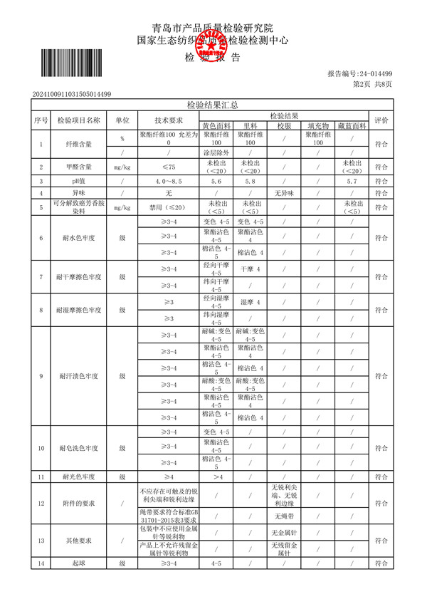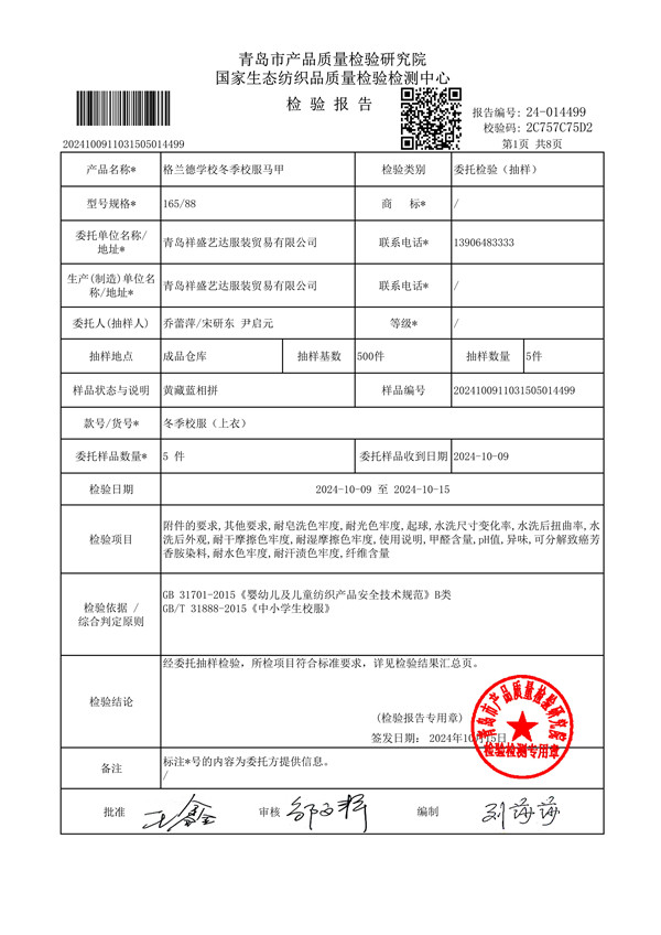 青岛格兰德小学青岛格兰德中学2024-2025学年学生棉背心质检报告公示