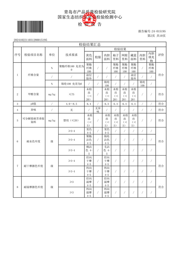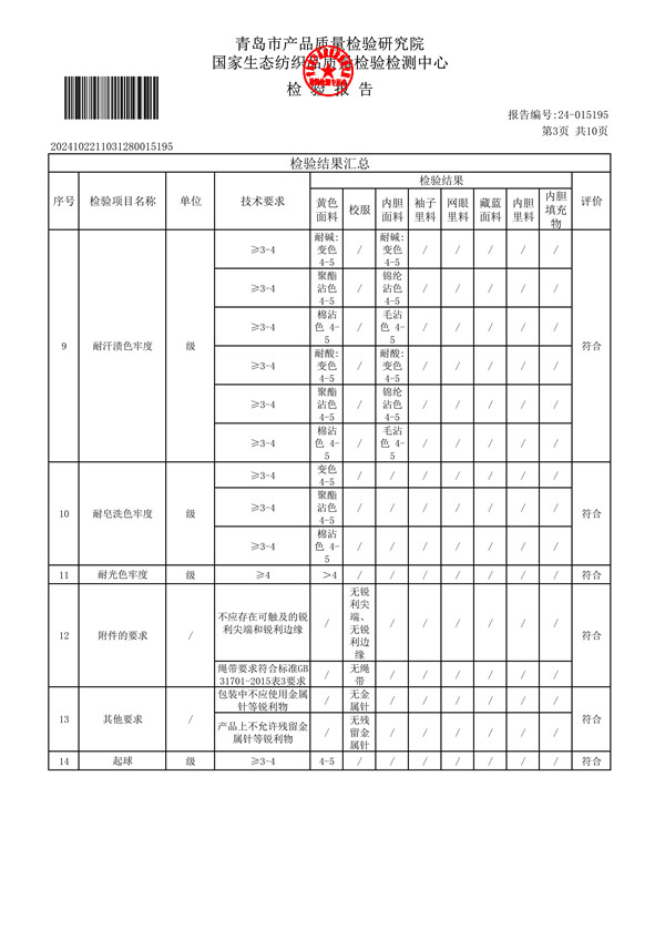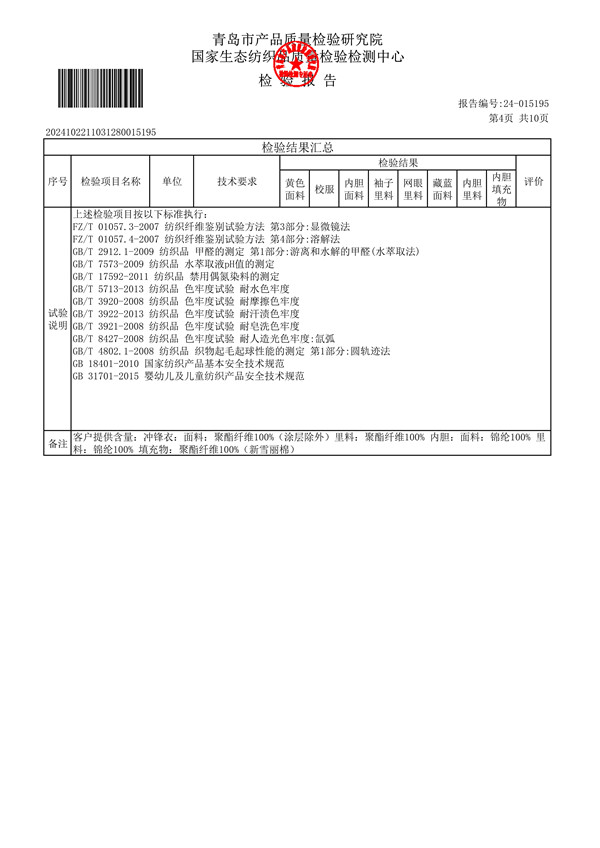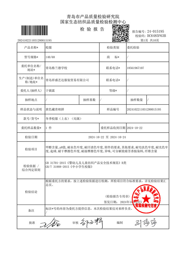 青岛格兰德小学青岛格兰德中学2024-2025学年学生棉服质检报告公示