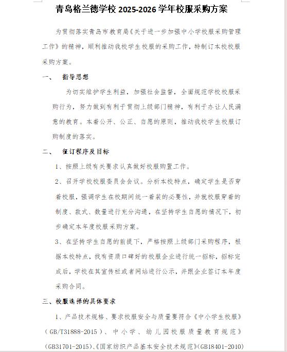青岛格兰德学校2025-2026学年学生制服装质检合格公示