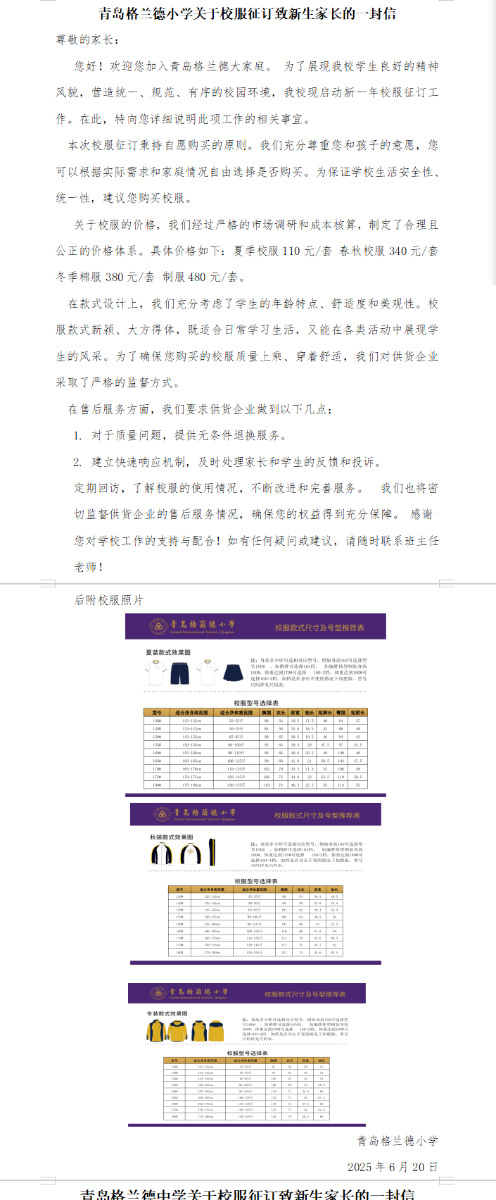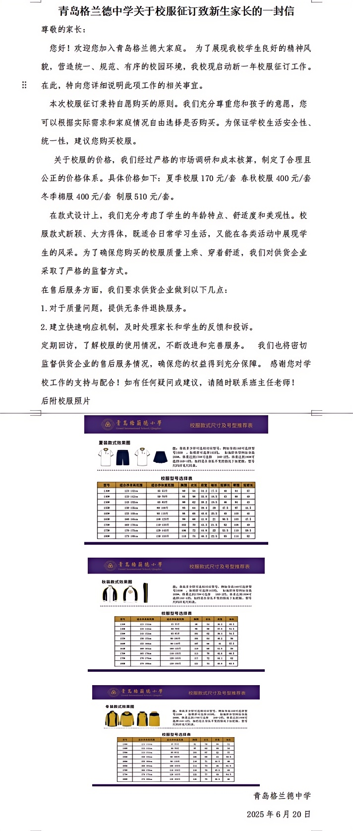 青岛格兰德学校2025-2026学年学生制服装质检合格公示