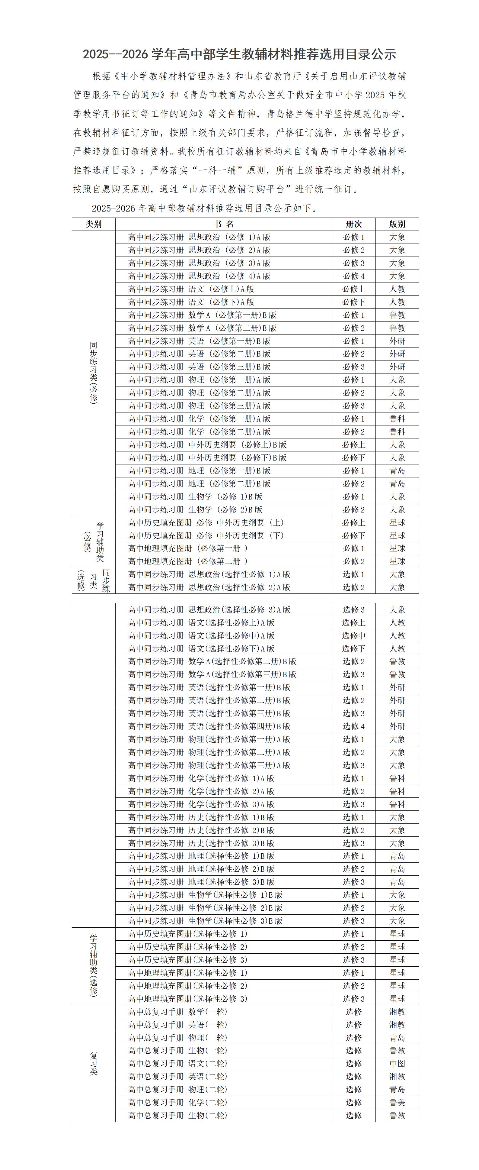 2025—2026学年高中部学生教辅材料推荐选用目录公示