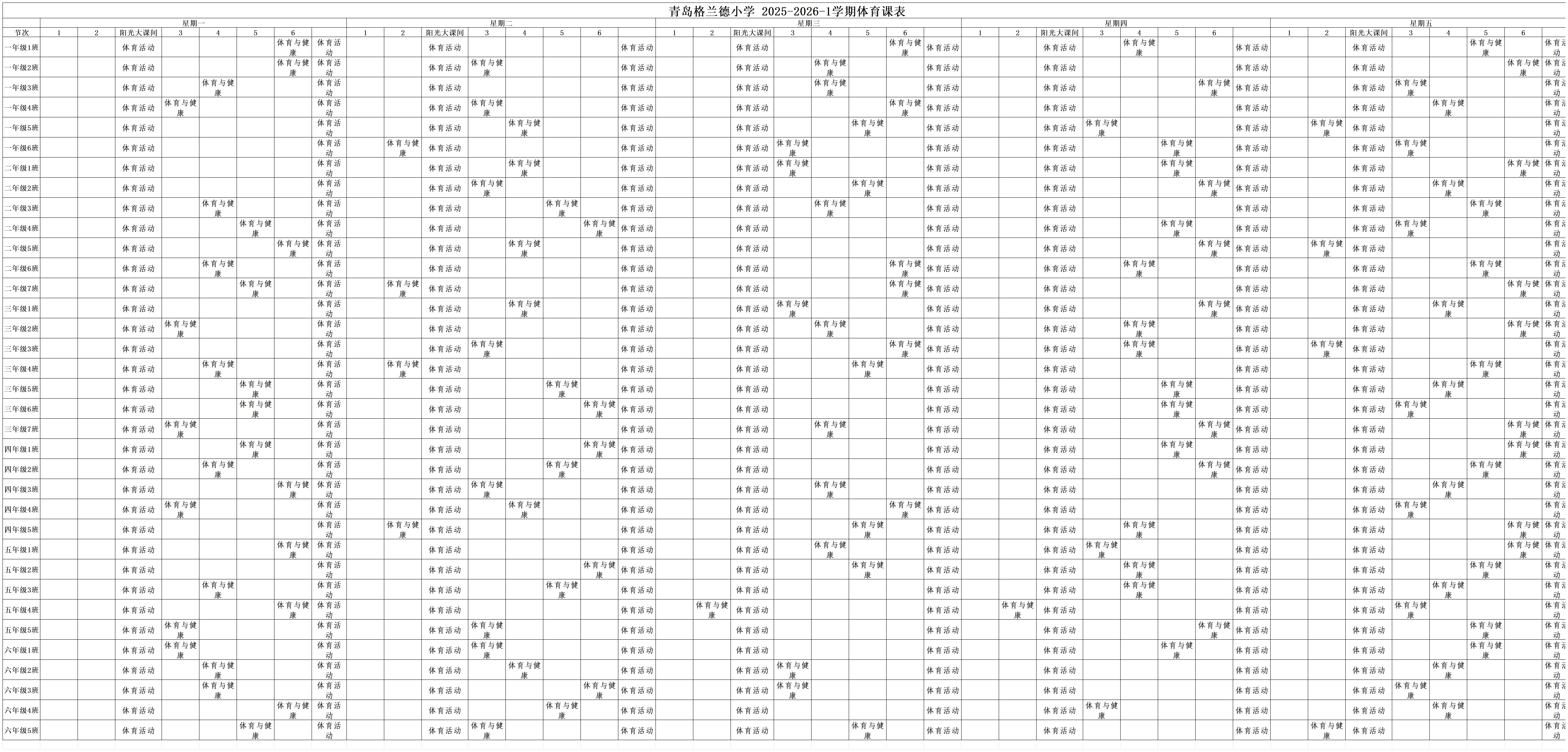 青岛格兰德小学2025-2026学年度第一学期体育课表公示