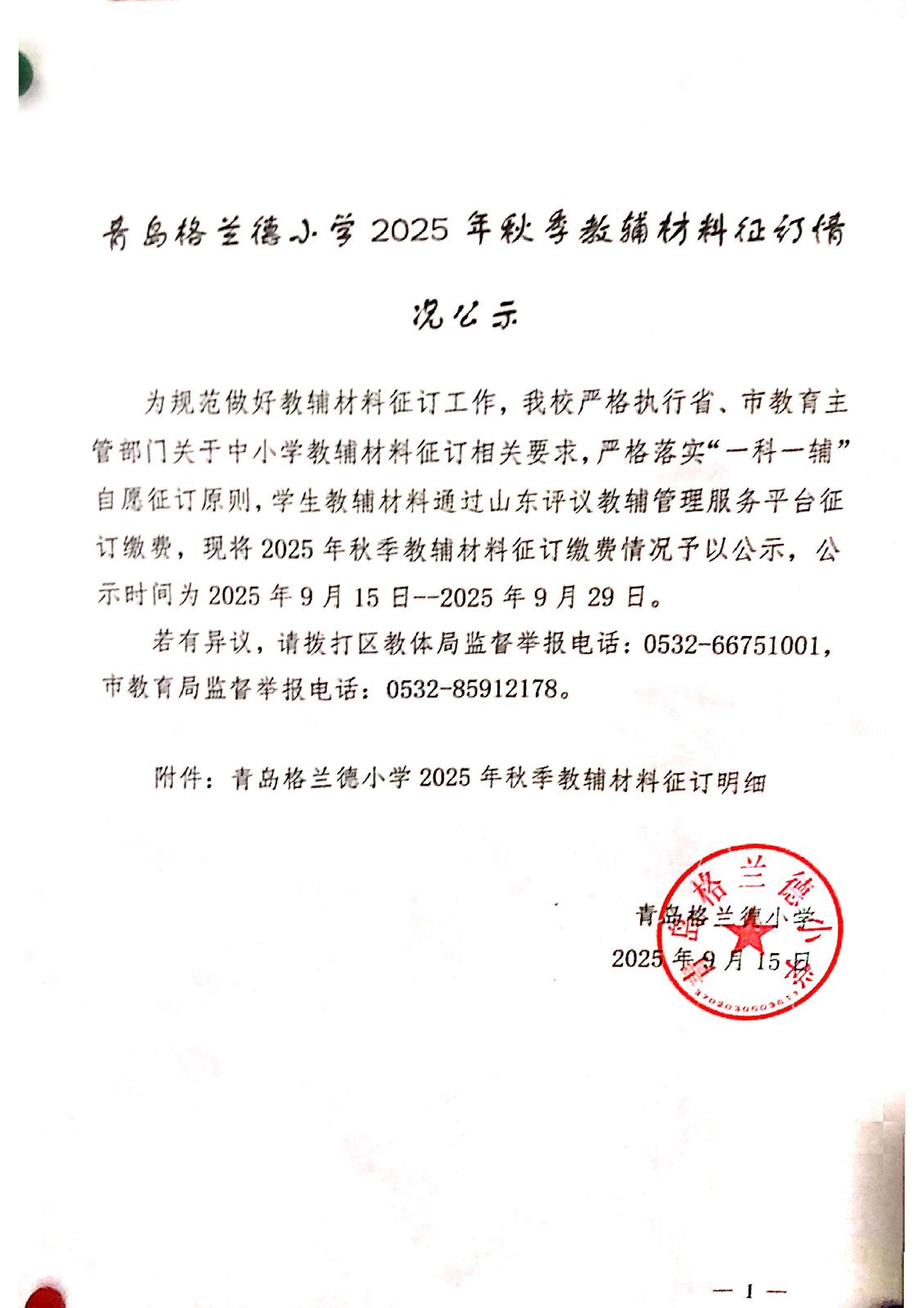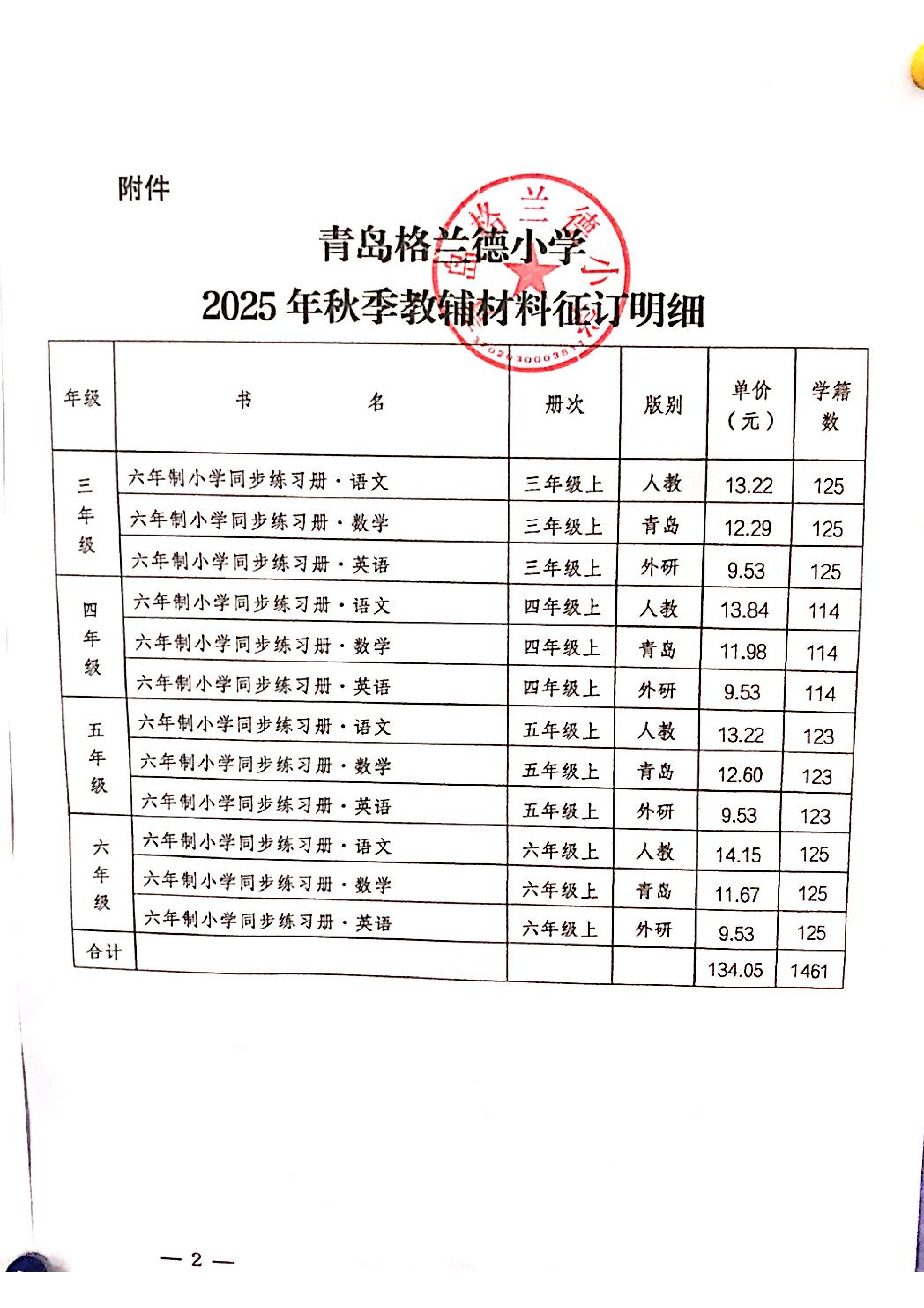 青岛格兰德小学2025年秋季教辅材料征订情况公示