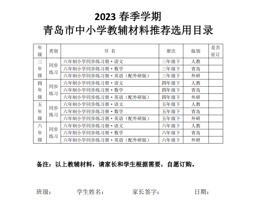 2023春季学期青岛市中小学教辅材料推荐选用目录