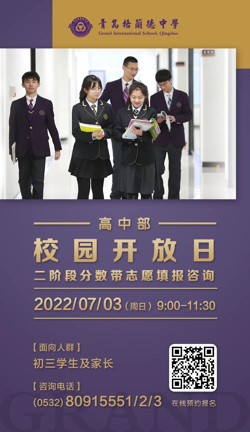 7月3日(周日)9:00,青岛格兰德中学高中部校园开放日暨二阶段分数带志愿填报咨询,手把手教你如何抓住二阶段录取这一重要节点,为孩子选择一所优质高中。
