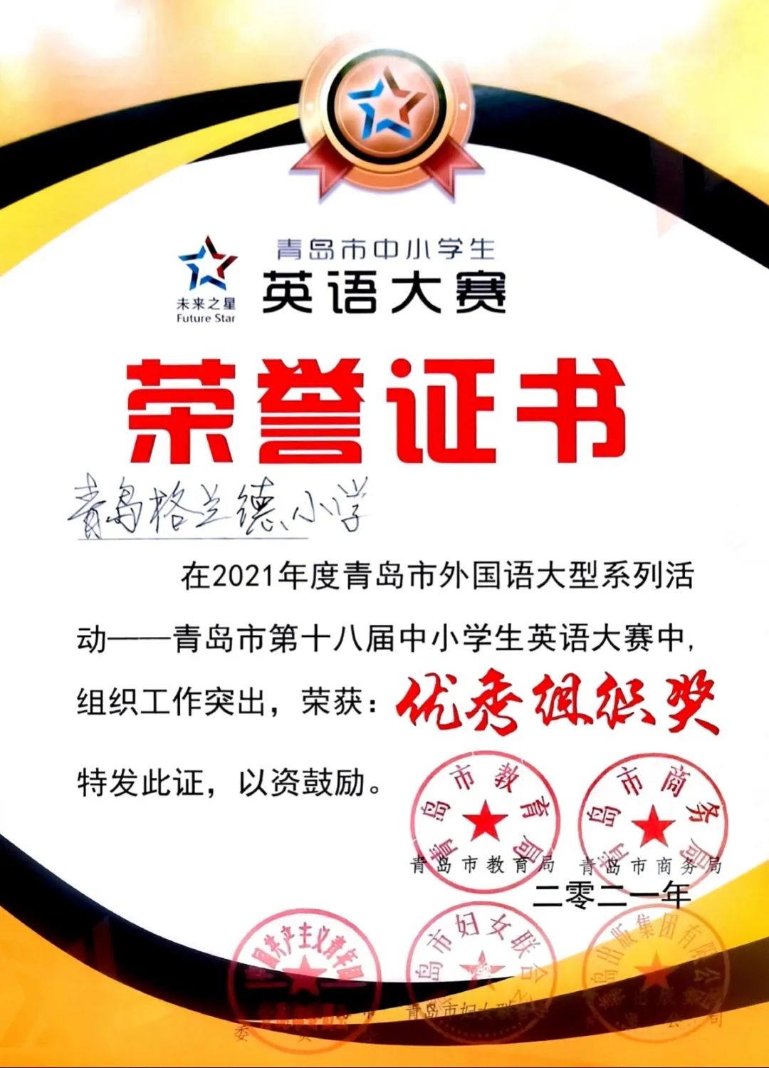 青岛市中小学英语大赛由青岛市教育局、青岛市团委、青岛市商务局等部门联合主办,该赛事已经成为是青岛市规模最大,最具影响力的英语比赛与英语文化交流平台。本届大赛自启动以来,受到全市广大中小学生以及家长的广泛关注,本届大赛共有14000余人报名参加,创下了历年参赛人数之最。经过初赛、复赛与决赛的层层选拔,格兰德学子在本次大赛中充分展示了在英语语言能力、思维品质、学习能力和文化素养等方面的超高水平,在个人赛与团体赛中全面开花,取得的令人羡慕的成绩。