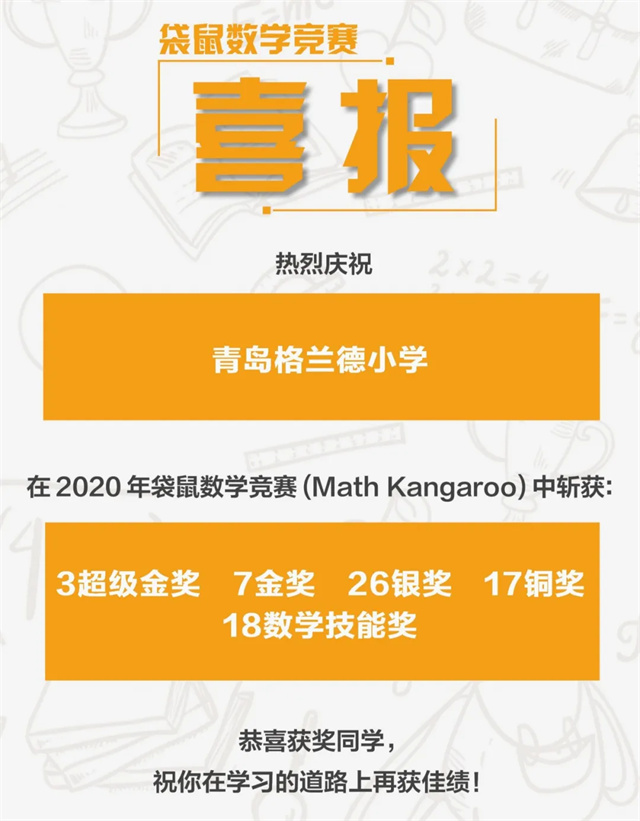 ☞ 在“2020年袋鼠数学竞赛” 中,青岛格兰德小学的参赛学生获得了3个超级金奖,7个金奖,26个银奖,17个铜奖,18个数学技能奖。