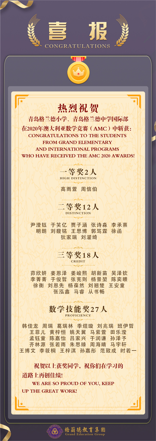 ☞ 澳大利亚数学竞赛结果公布,青岛格兰德小学、青岛格兰德中学国际部学子表现优异,多位同学从来自全国2435所国际学校和重点中小学的38516名学生中脱颖而出,斩获佳绩。