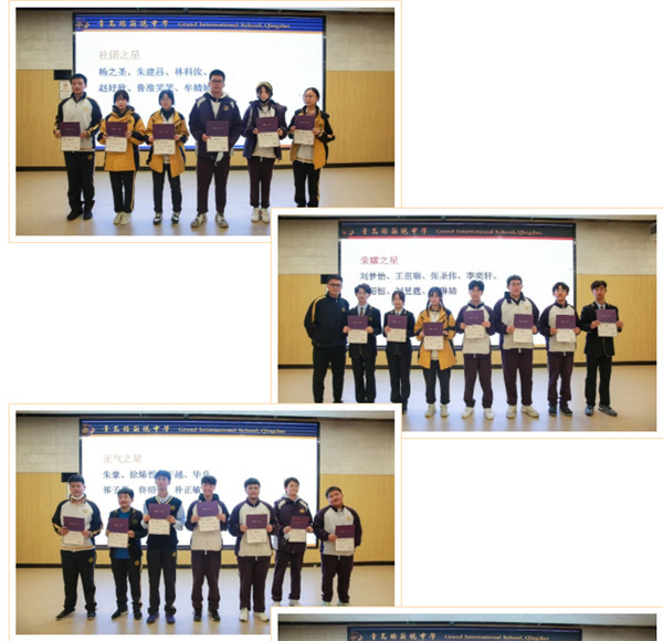 激动人心的颁奖环节开始了!多才多艺的“社团之星”、为校增光的“荣誉之星”、崇尚文明正义的“正气之星”、积累点滴收获积沙成塔的进步之星、以拼搏的姿态跋涉书山学海的领航之星.....同学们在校生活点滴闪亮品质都能被发现、肯定!在“办一所生命绽放的学校”这一办学目标的引领下,格兰德教育教学的点滴都彰显“以人为本”的价值引领。