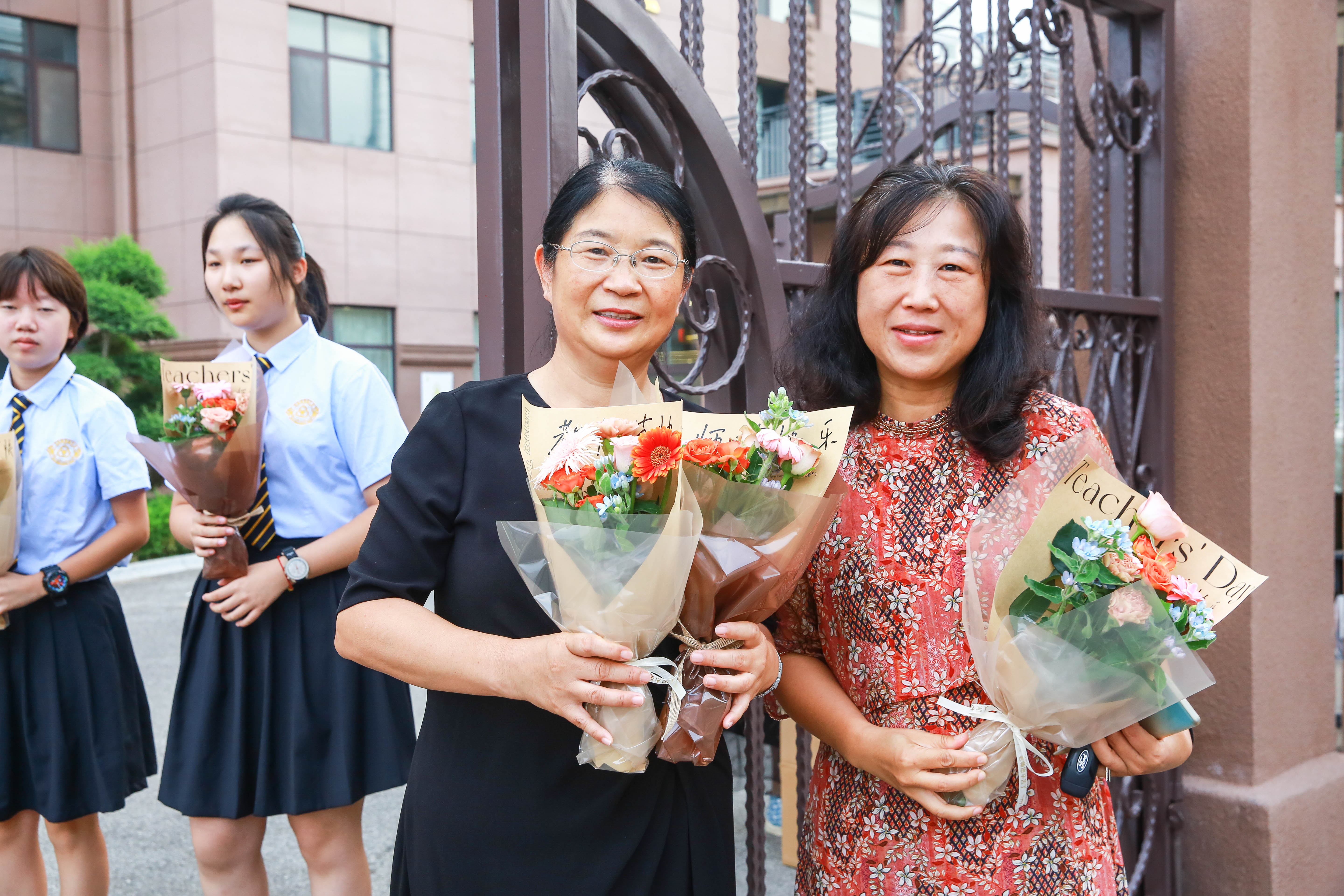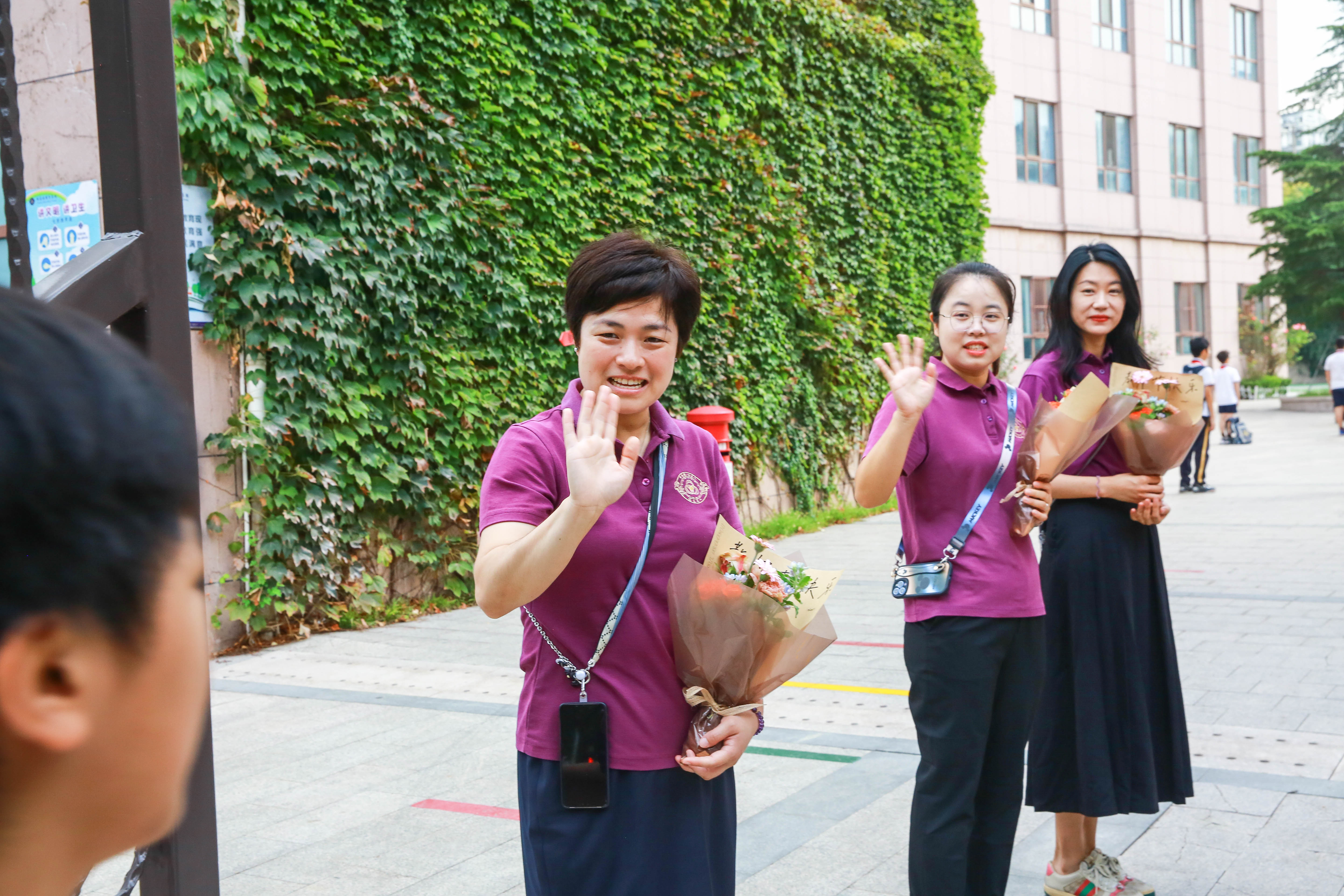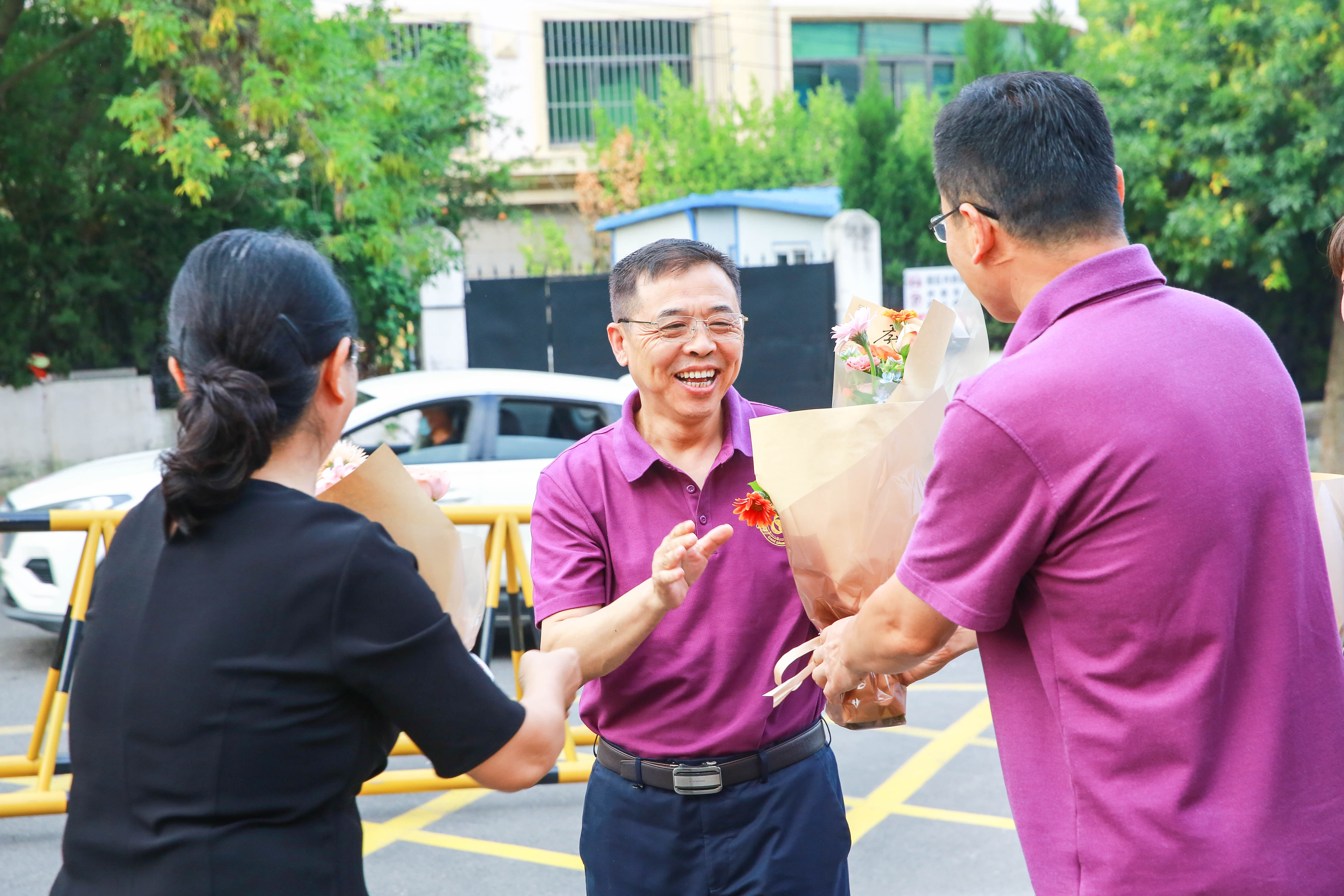 晨光熹微中,校领导准时等候在校门口,手捧鲜花,为老师们送上节日的第一份问候。