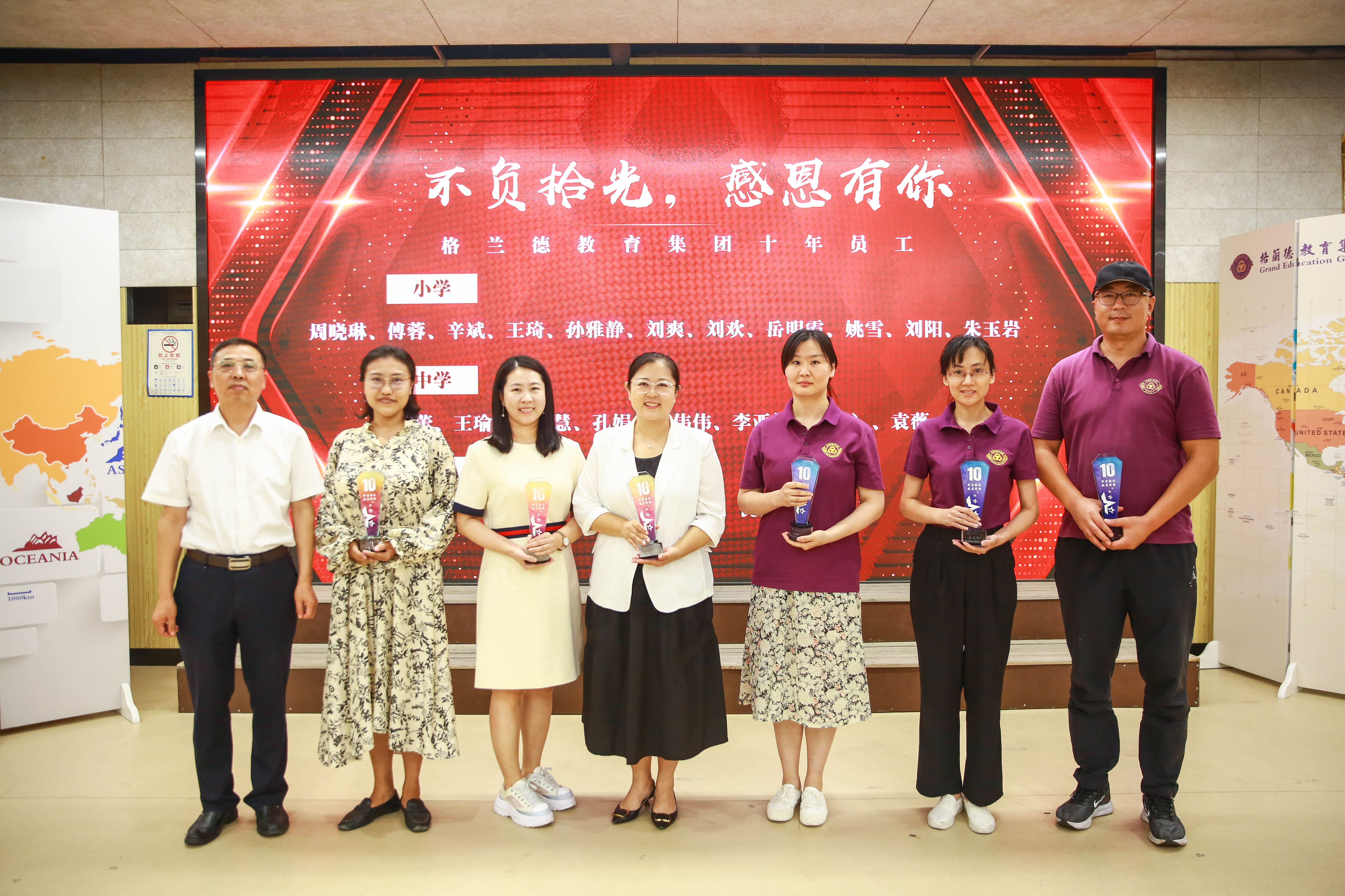 我们看不见时间,但可以看见时间的力量。十年,用一粒种子成就一棵树的昂扬,用一群人的无悔迎接格兰德的向上。十年,属于追光的人,捕梦的人,躬身三尺讲台的人,仰望星辰大海的人。正因如此,格兰德21年的岁月中,才始终充满蓬勃的力量。24位校龄十年以上的教职员工从高福生校长手中接过见证时光的奖杯,他们用自己的青春书写着格兰德的成长,他们的光芒也将照亮格兰德的下一个十年。