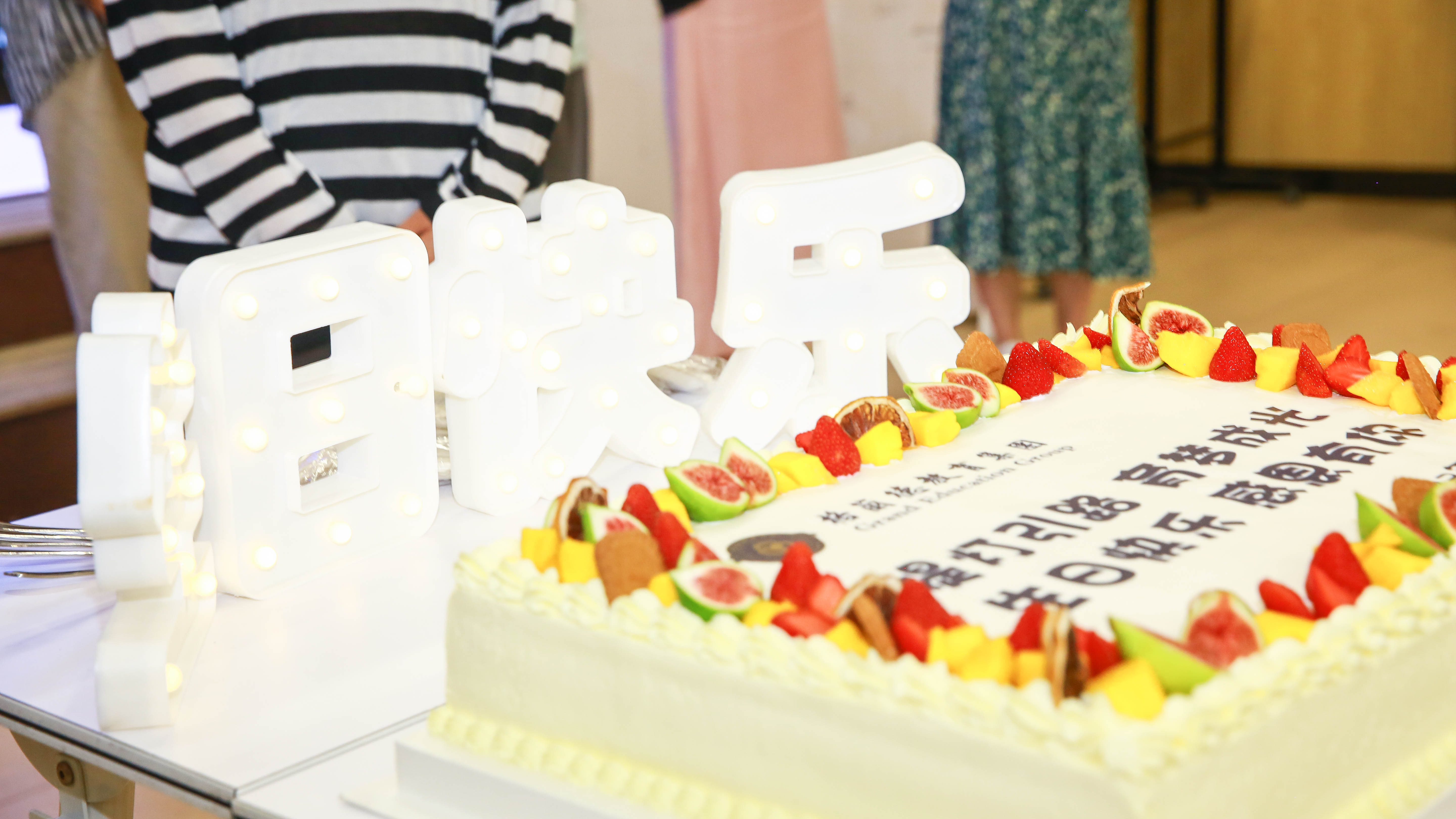 九月是19位格兰德人共同的生日,校长致辞过后,集体生日会惊喜到来。大屏投射的照片是19位老师的格兰德瞬间,缓缓入场的生日蛋糕是学校精心准备的甜蜜,观众席中手机光亮组成的星海和齐声高唱的生日快乐歌,是全体教师的祝福。高福生校长为老师们送上生日卡,并一起切蛋糕,分享快乐。