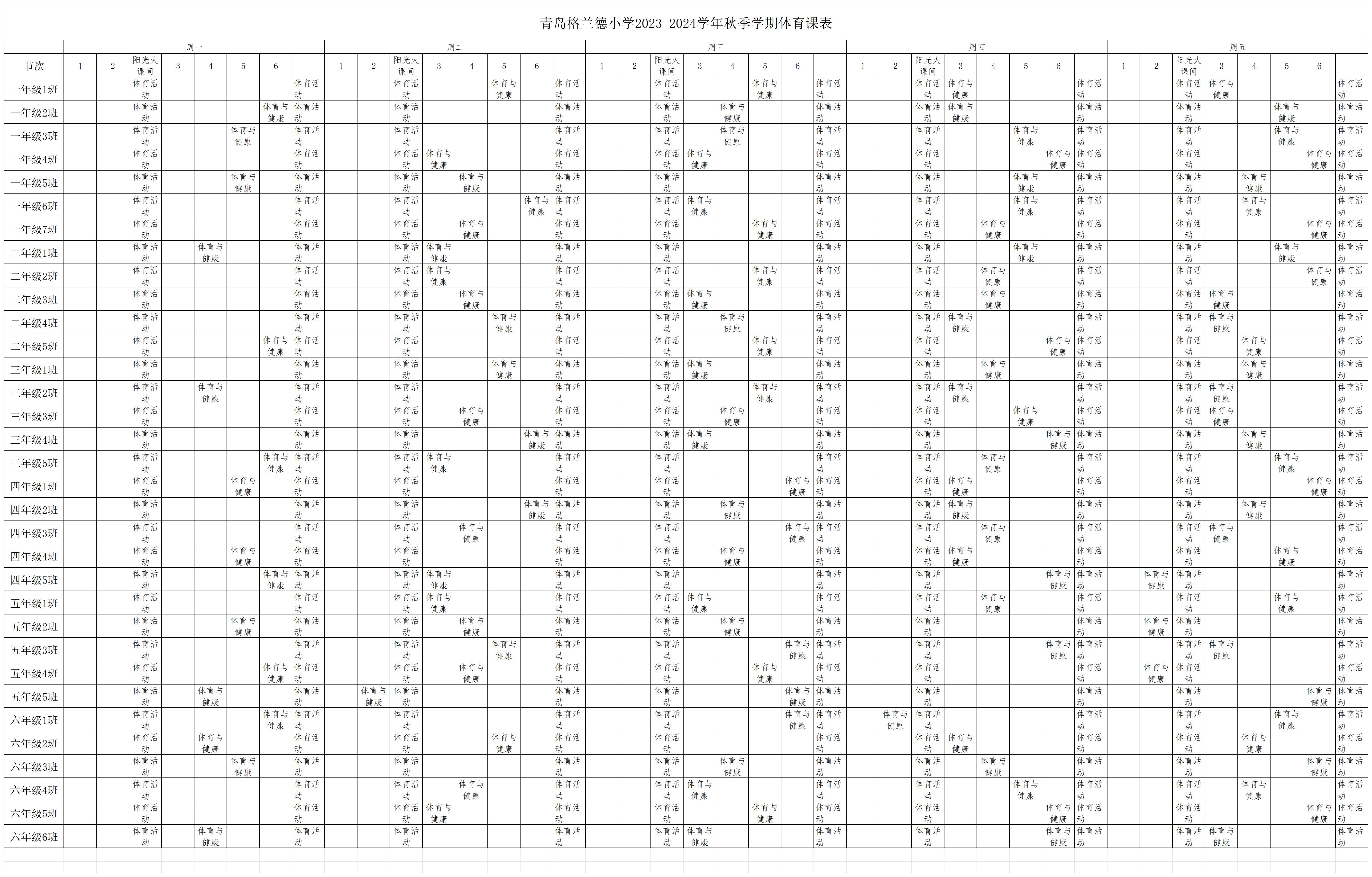 青岛格兰德小学2023-2024学年秋季学期体育课表公示