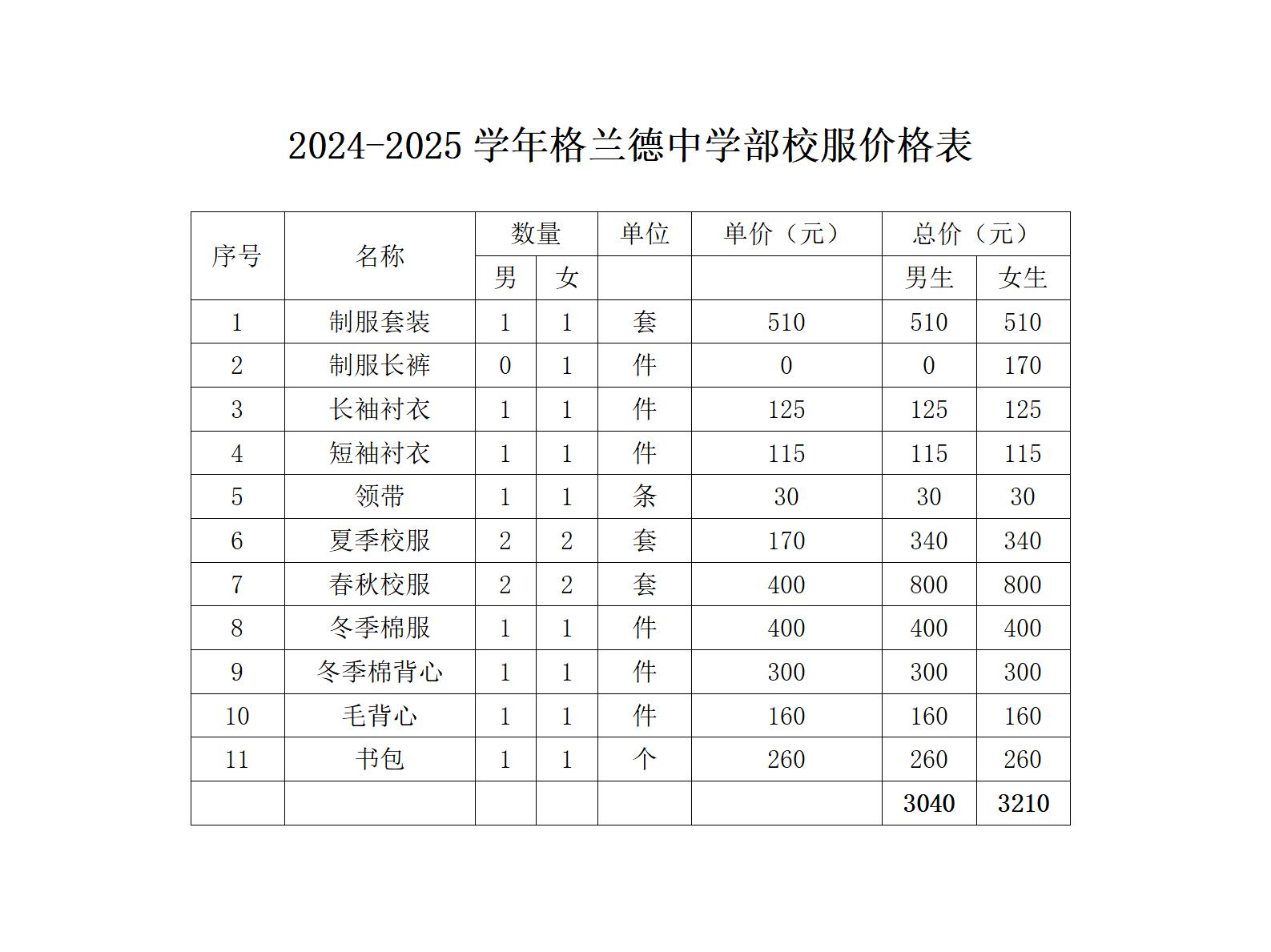 2024—2025学年格兰德中学校服价格表
