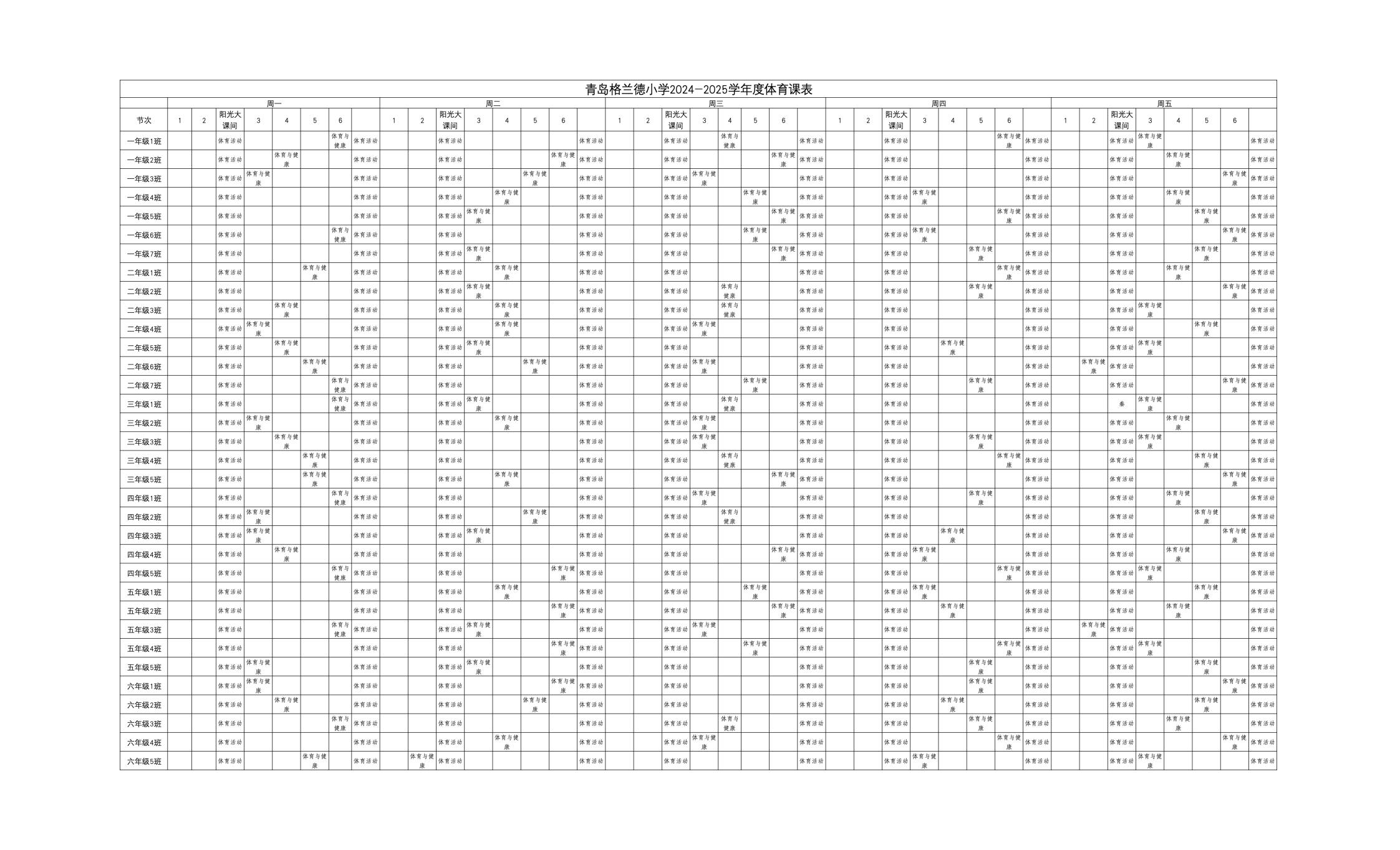 青岛格兰德小学2024-2025学年度体育课表公示