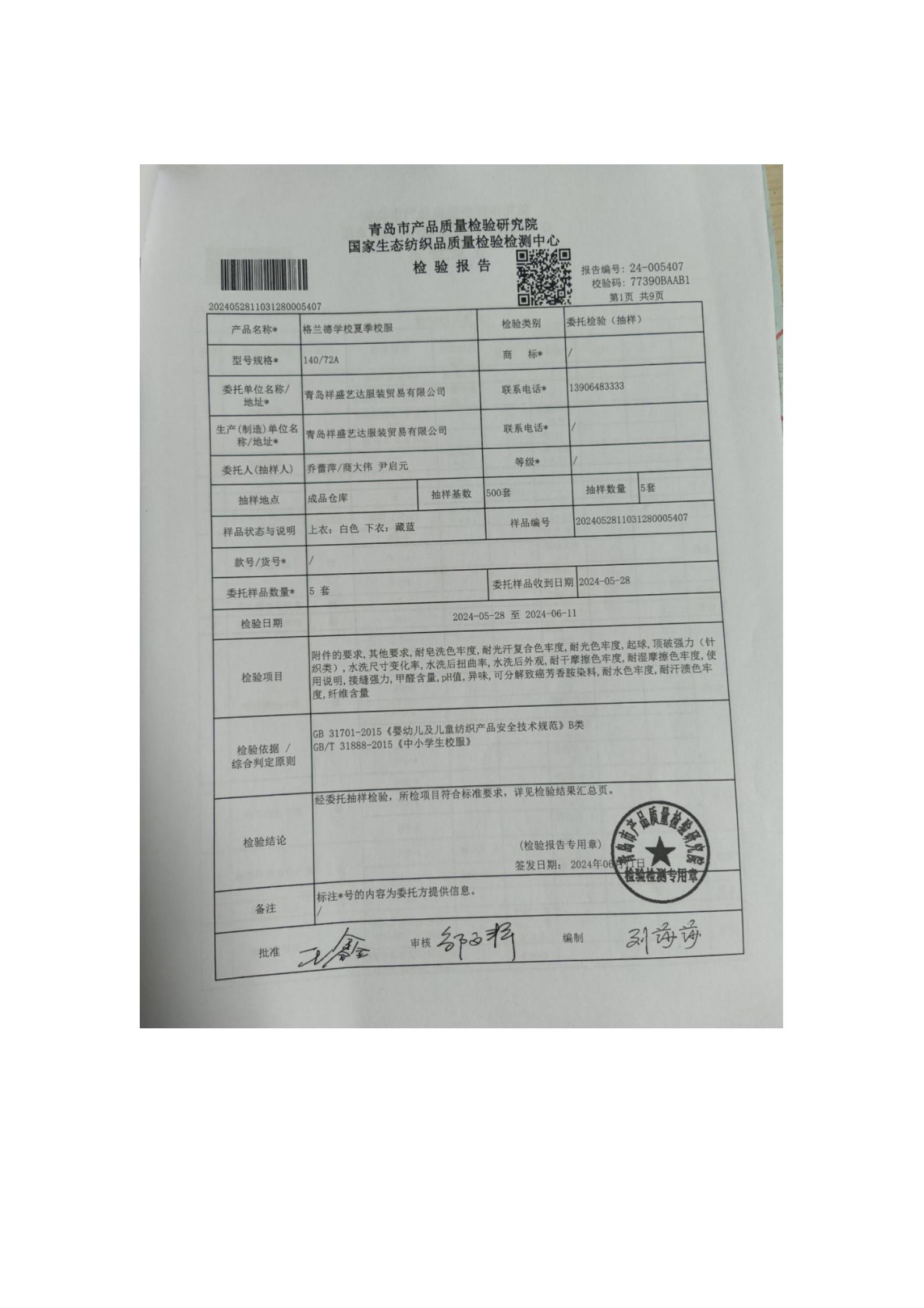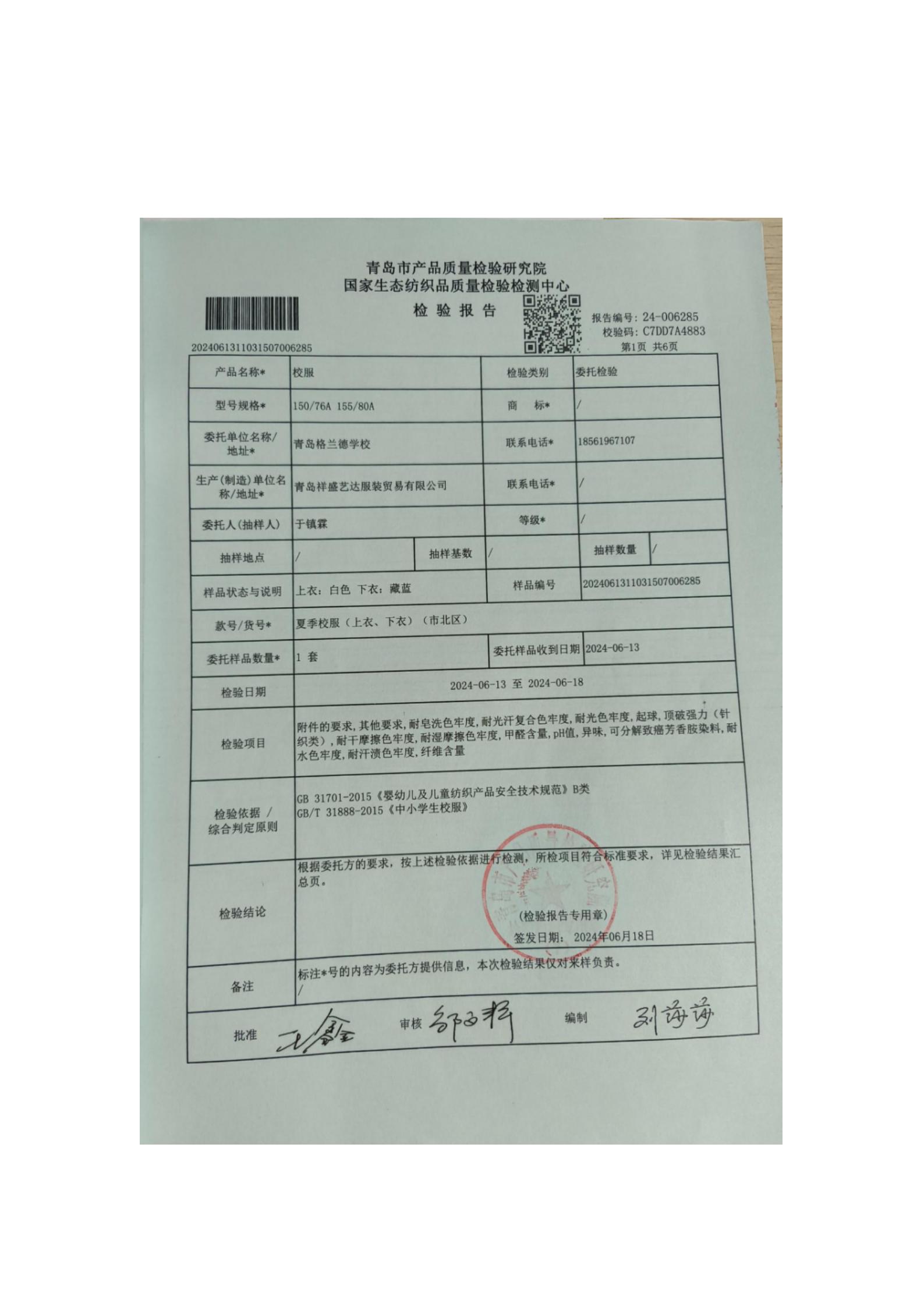 按照青岛市教育局的规定和要求,青岛祥盛艺达服装贸易有限公司抽样送检,青岛格兰德中小学校服领导小组和校服家长委员会派出代表,2024级学生夏季校服抽样送检,学校企业双质检报告合格,特此公示。
