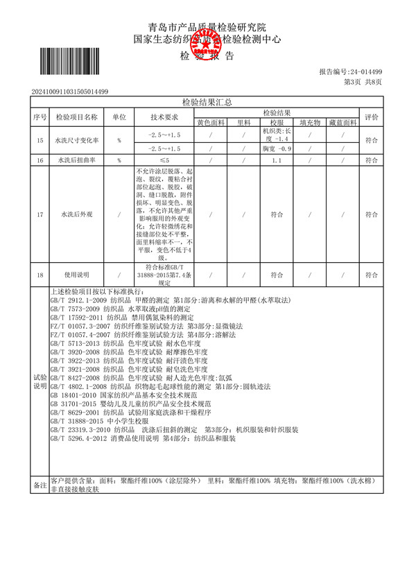 青岛格兰德小学青岛格兰德中学2024-2025学年学生棉背心质检报告公示