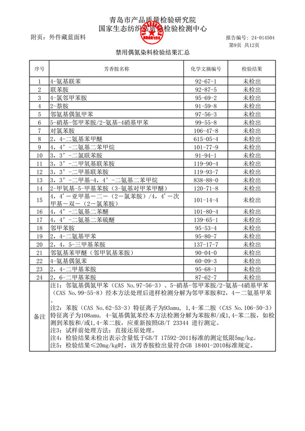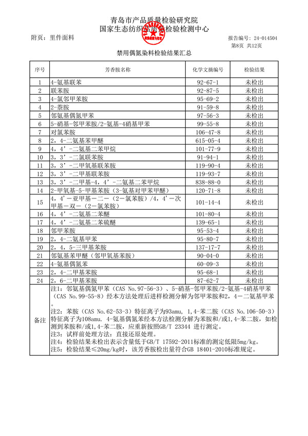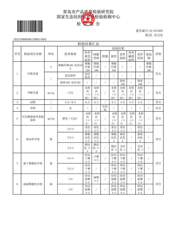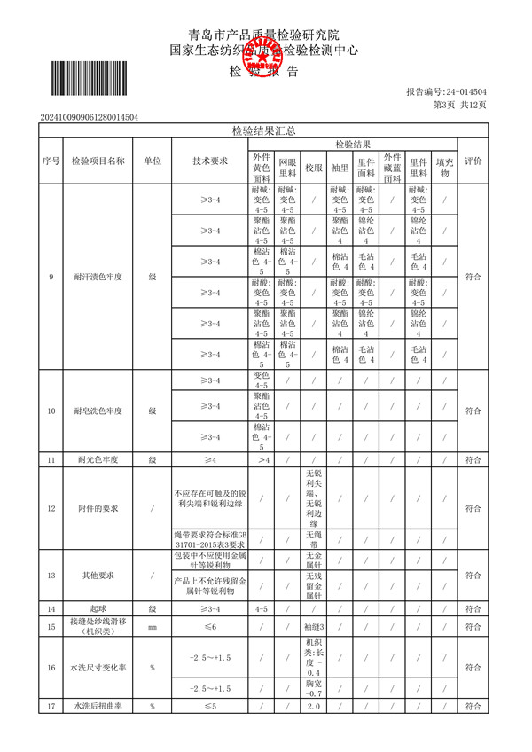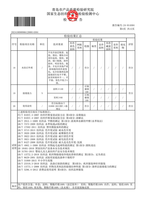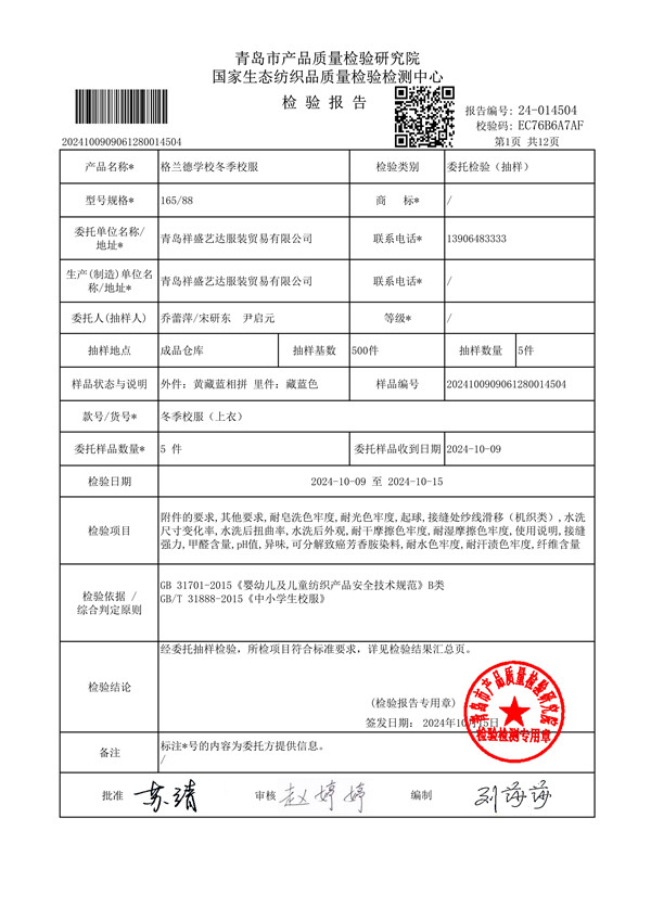 青岛格兰德小学青岛格兰德中学2024-2025学年学生棉服质检报告公示