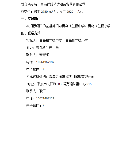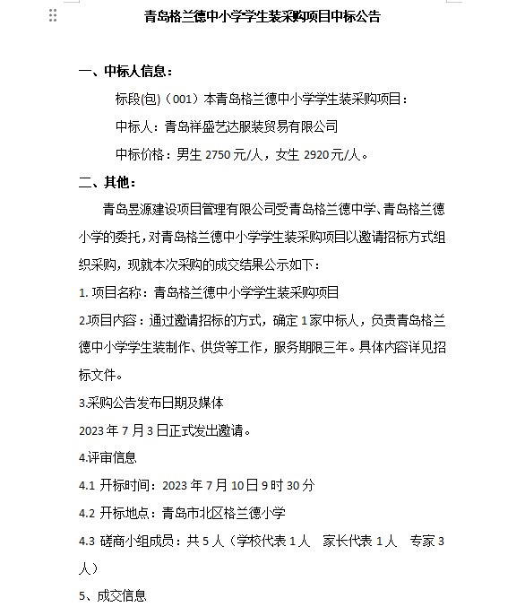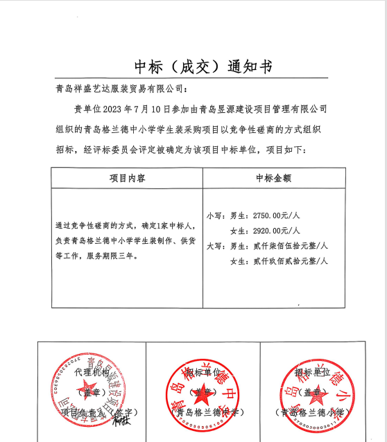 格兰德学生校服中标公示