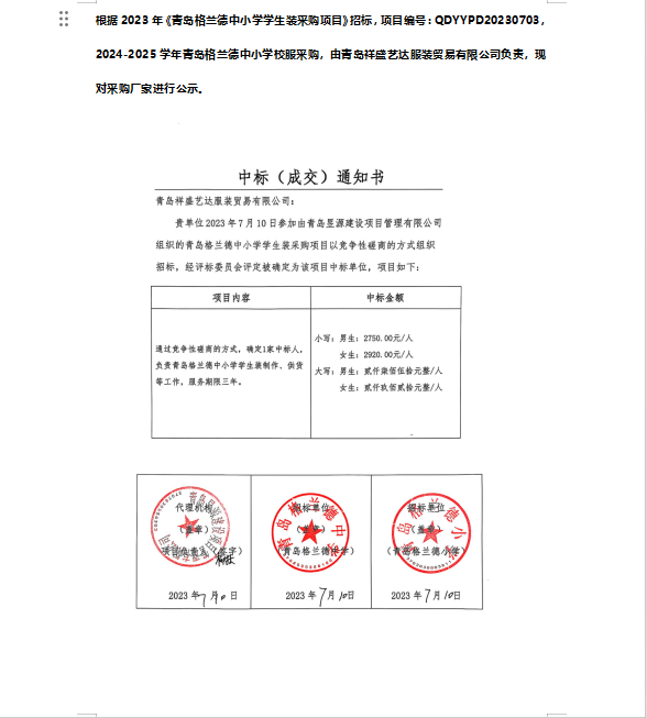 青岛格兰德学校2025-2026学年学生制服装质检合格公示