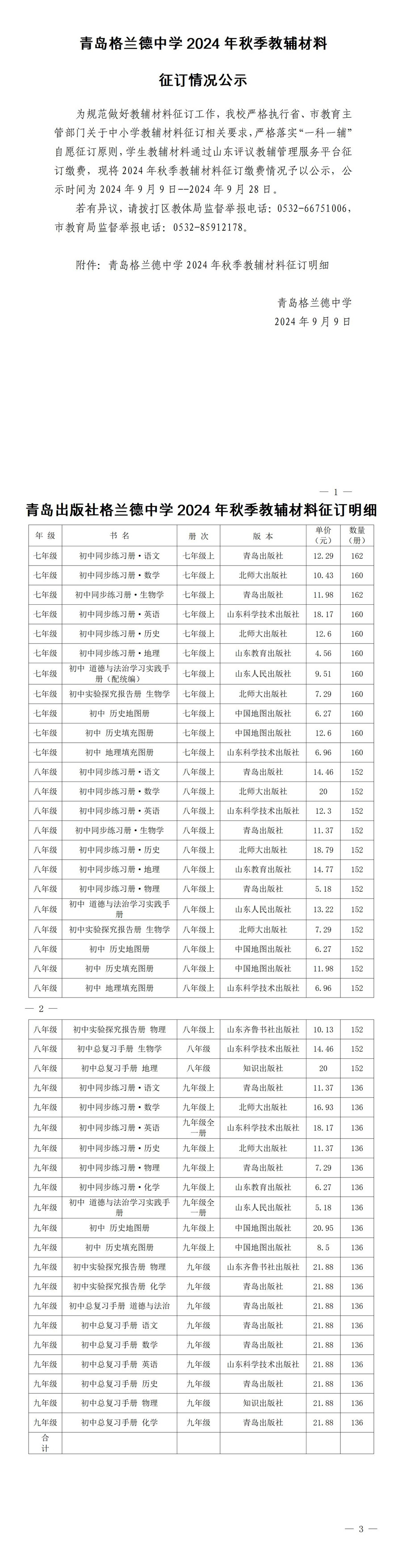 青岛格兰德中学2024年秋季教辅材料征订情况公示