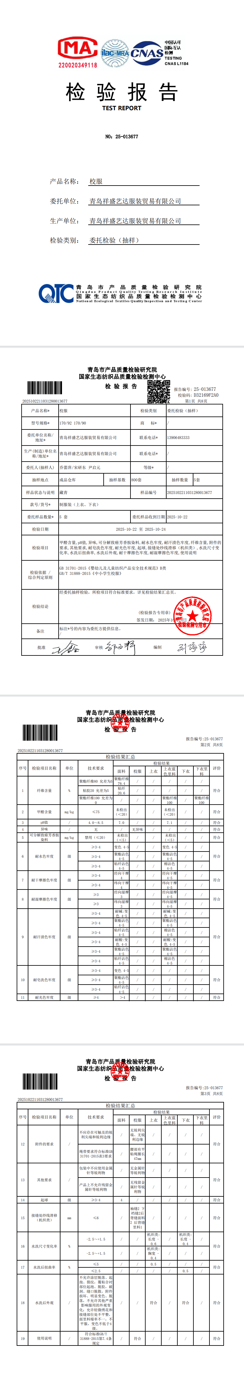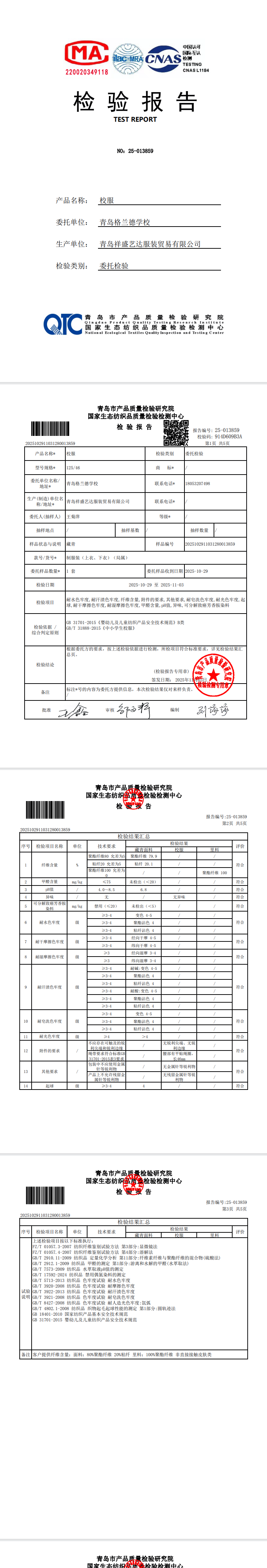青岛格兰德学校2025-2026学年学生制服装质检合格公示