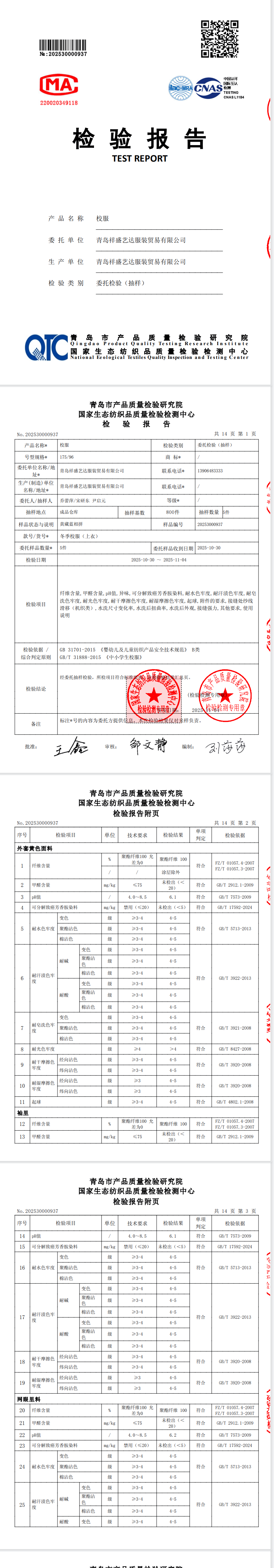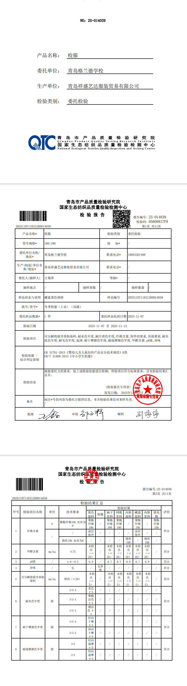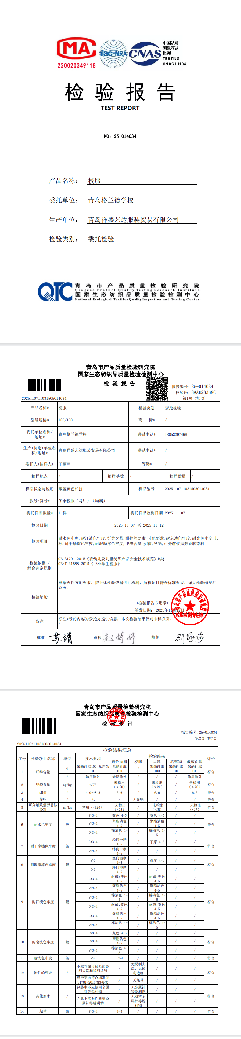 青岛格兰德学校2025-2026学年学生制服装质检合格公示